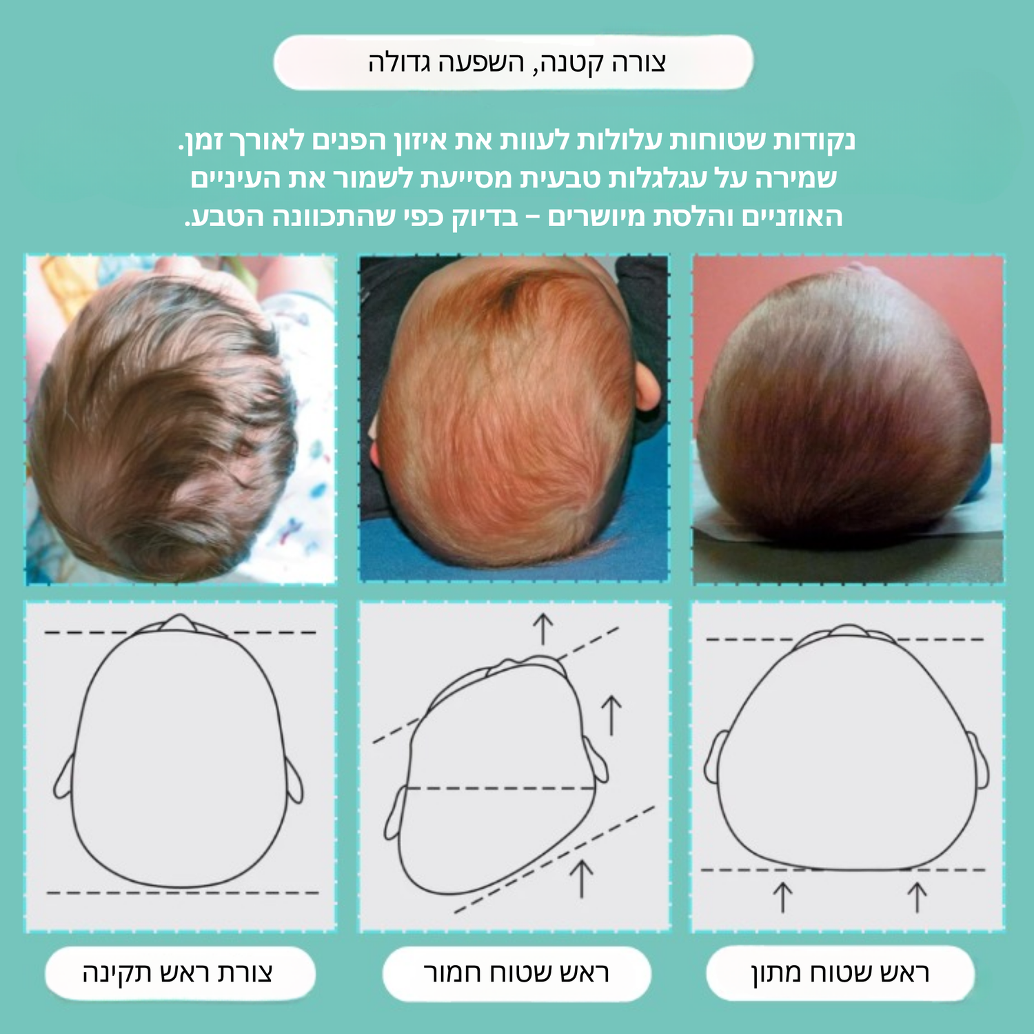 בחודשים הראשונים הגולגולת של התינוק שלכם עדיין רכה וניתנת לעיצוב. כששוכבים זמן רב באותה תנוחה, במיוחד על הגב, עלול להיווצר לחץ מצטבר על אותו אזור – וזה מה שמוביל לפעמים ל"ראש שטוח". אתם עשויים לשים לב שהחלק האחורי של הראש או צד אחד נראה מעט יותר שטוח מהשני. זה מצב נפוץ, אבל חשוב להיות מודעים אליו כדי לעזור לשמור על צורה טבעית ועגולה של הראש כבר מההתחלה.