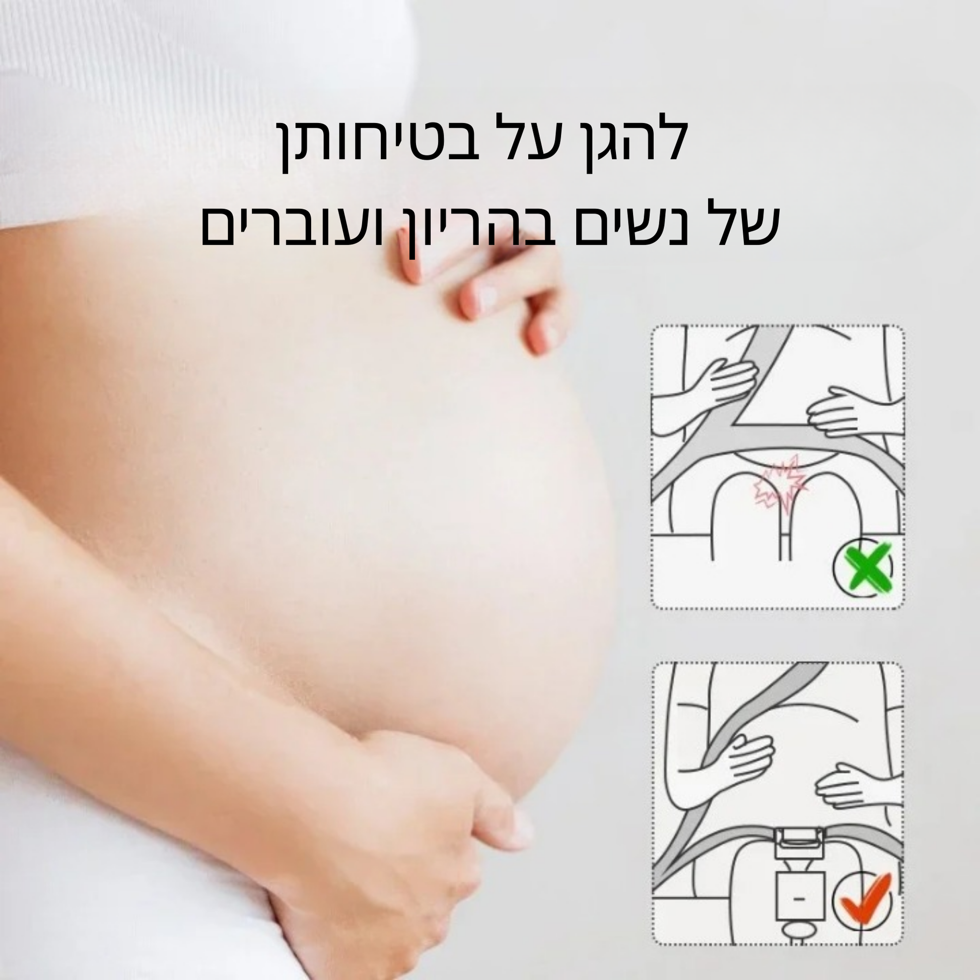 המוצר לא מבטל את פעולת החגורה – הוא רק משנה את נקודת המגע התחתונה שלה, כך שהיא לא תלחץ על הבטן. עדיין נשמרת ההגנה הרגילה, פשוט בלי הסיכון ללחץ ישיר ברחם.